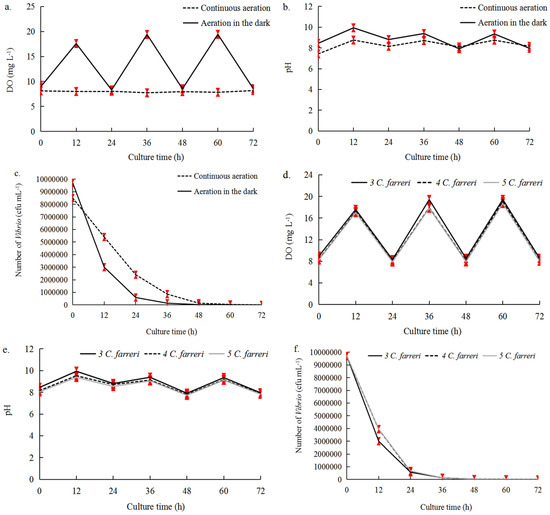 DO, pH, and Vibrio number in Experiment B with the addition of three Vibrio suspensions (107 cfu mL−1). (a–c) In the co-culture system of 30 g U. pertusa–3 C. farreri with different aeration conditions; (d–f) 30 g of U. pertusa was co-cultured with 3, 4, and 5 C. farreri under aeration in the dark. The error bars (red) stand for the standard deviation, n = 3 (p < 0.05).