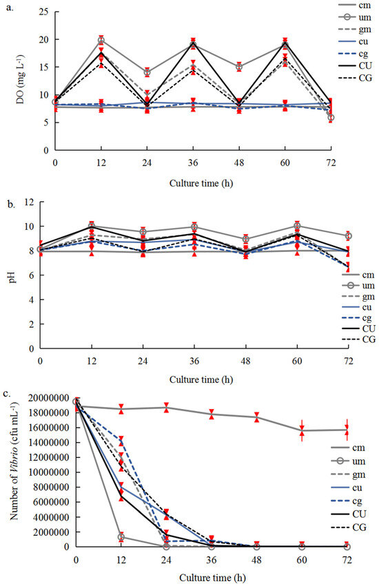 DO (a), pH (b), and Vibrio number (c) in the seawater of Experiment C with the addition of three Vibrio suspensions (107 cfu mL−1). The error bars (red) stand for the standard deviation, n = 3 (p < 0.05). cm: mono-culture of C. farreri with continuous aeration; um: mono-culture of U. pertusa without aeration; gm: mono-culture of G. lemaneiformis without aeration; cu: co-culture of C. farreri–U. pertusa under continuous aeration; cg: co-culture of C. farreri–G. lemaneiformis under continuous aeration; CU: co-culture of C. farreri–U. pertusa under aeration in the dark; CG: co-culture of C. farreri–G. lemaneiformis under aeration in the dark. CU and CG were the experimental groups; the others were the control groups.