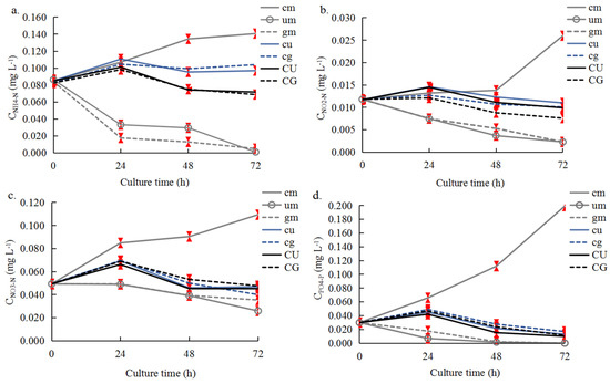 The concentrations of NH4-N (a), NO2-N (b), NO3-N (c), and PO4-P (d) in Experiment D. Symbols and culture conditions are as described in Figure 3. The error bars (red) stand for the standard deviation, n = 3 (p < 0.05).