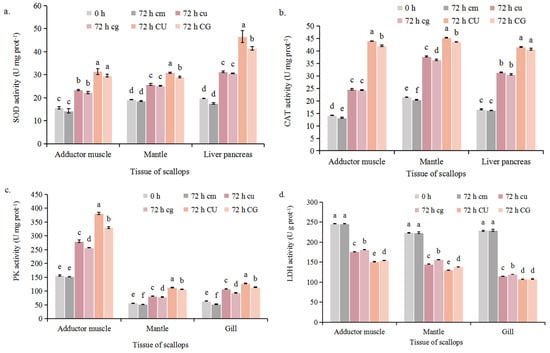 Pyruvate kinase (PK) activities significantly increased in the CU and CG groups at 72 h and were higher in the CU and CG groups than in the cu and cg groups at 72 h (p < 0.05) (Figure 5c) (p < 0.05). PK activities varied among scallop tissues; PK activity was higher in the adductor muscles (151.69 U mg−1–381.29 U mg−1) than in the gills and mantle. Lactate dehydrogenase (LDH) activities in the adductor muscles, mantle, and gills decreased over the 72 h culture period (p < 0.05) (Figure 5d). In the CU and CG groups, LDH activity decreased from 246.31 U g−1 (0 h) to 151.29 U g−1 (CU) and 154.68 U g−1 (CG) in the adductor muscles, from 224.29 U g−1 (0 h) to 130.15 U g−1 (CU) and 138.21 U g−1 (CG) in the mantle, and from 229.22 U g−1 (0 h) to 107.74 U g−1 (CU) and 108.14 U g−1 (CG) in the gills. After co-culture for 72 h, LDH activities were lower under aeration in the dark than under continuous aeration (p < 0.05).