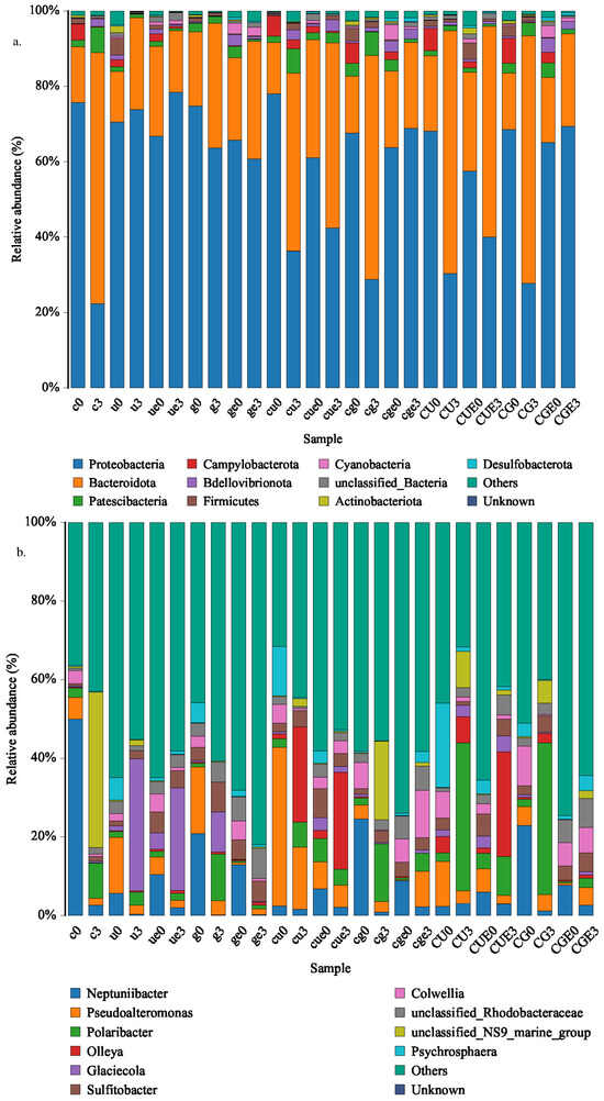 A histogram of the 10 species with the highest relative abundance at the phylum (a) and genus (b) levels of 26 samples from the seawater environment and seaweed epiphytes. 0: before culture; 3: after 3 days of culture; e: epiphytic microorganisms on seaweeds; without “e”: microorganisms in seawater; c: the mono-culture of C. farreri; u: the mono-culture of U. pertusa; g: the mono-culture of G. lemaneiformis; cu and cg: the co-culture of C. farreri–U. pertusa and C. farreri–G. lemaneiformis under continuous aeration, respectively; CU and CG: the co-culture of C. farreri–U. pertusa and C. farreri–G. lemaneiformis under aeration in the dark, respectively.
