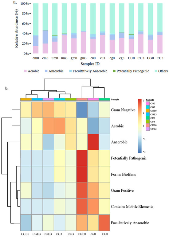 The histogram (a) and heat map (b) of the phenotype prediction results. (a) Seawater and epiphytic microorganisms from each group were pooled for analysis. (b) Seawater and epiphytic microorganisms for the CU and CG groups. The symbols and culture conditions are as described in Figure 6.