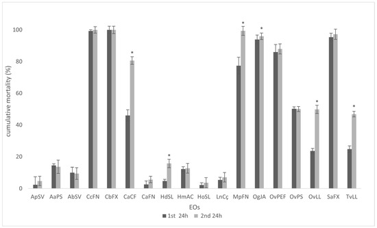 - Barbosa, P.; Faria, J.M.S.; Mendes, M.D.; Dias, L.S.; Tinoco, M.T.; Barroso, J.G.; Pedro, L.G.; Figueiredo, A.C.; Mota, M. Bioassays against pinewood nematode: Assessment of a suitable dilution agent and screening for bioactive essential oils. Molecules 2012, 17, 12312–12329. [Google Scholar] [CrossRef] [PubMed]