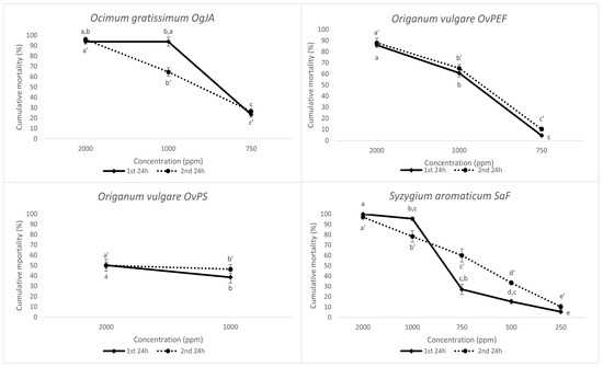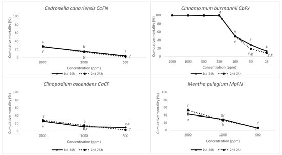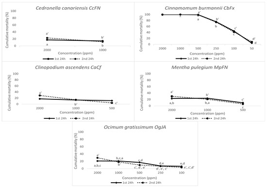 | Essential Oil | Code | Lethal Concentration (LC50, ppm) | Gradient Equation R2 | ||