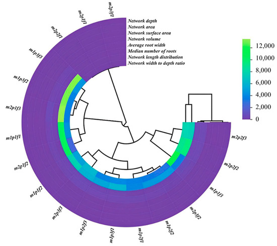 Within a column, means followed by the same letter are not significantly different at p < 0.05 according to the least significant different test. Treatment includes non-inoculation with mycorrhiza (m1) and inoculation with mycorrhiza (m2). pH1 = 5 (p1), pH2 = 7 (p2), and pH3 = 8 (p3).
