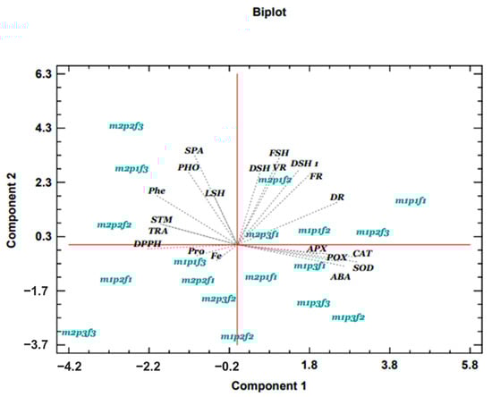 | Treatments | Phenol of shoot (mg g−1 FW) | DPPH (%) | Proline (µmol g−1 FW) | Fe conc (mg kg−1 DW) | ABA (ng−1 g FW) | APX (u/mg Pr) | SOD (u/mg Pr) | POX (u/mg Pr) | CAT (u/mg Pr) | |