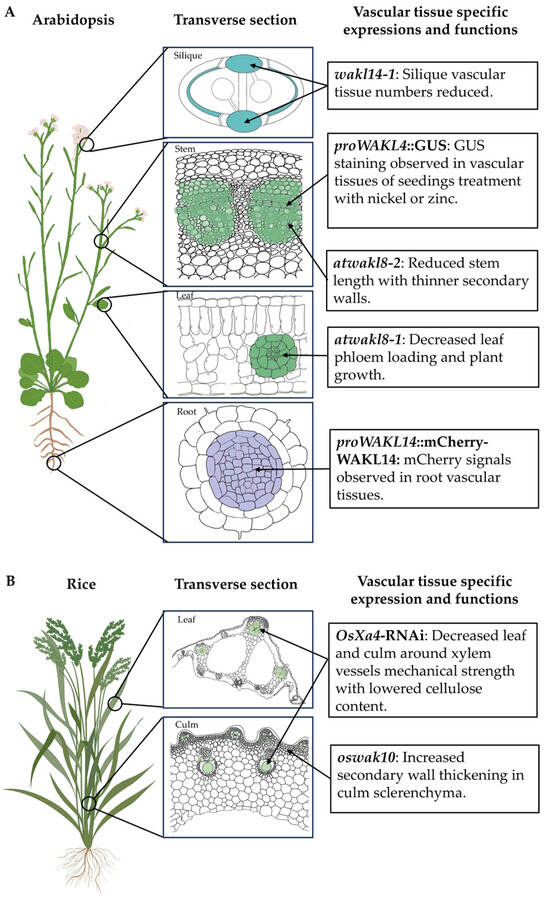 Summary of expression patterns and biological functions of WAKs involved in secondary wall development in Arabidopsis and rice. Expression profiles of WAKs in shoot meristem, flower, silique, stem, leaf, and root, and transgenic plant phenotypes in Arabidopsis (A) and rice (B). Colored cells indicate tissue expression patterns of WAKs in vascular tissues.