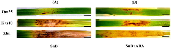 The effect of ABA treatment on symptom development of leaves of the three wheat genotypes infected with S. nodorum SnB. (A) Wheat plants not treated with ABA and infected with the SnB isolate (SnB); (B) wheat plants treated with 2 µm ABA and infected with the SnB isolate (SnB + ABA). Wheat cultivars designations: Omskaya 35 (Om35), Kazahstanskaya 10 (Kaz10), and Zhnitsa (Zhn). The photographs show the results of a typical variant from a series of experiments (n = 30). The development of symptoms was recorded 8 days after infection. Bars = 15 mm.