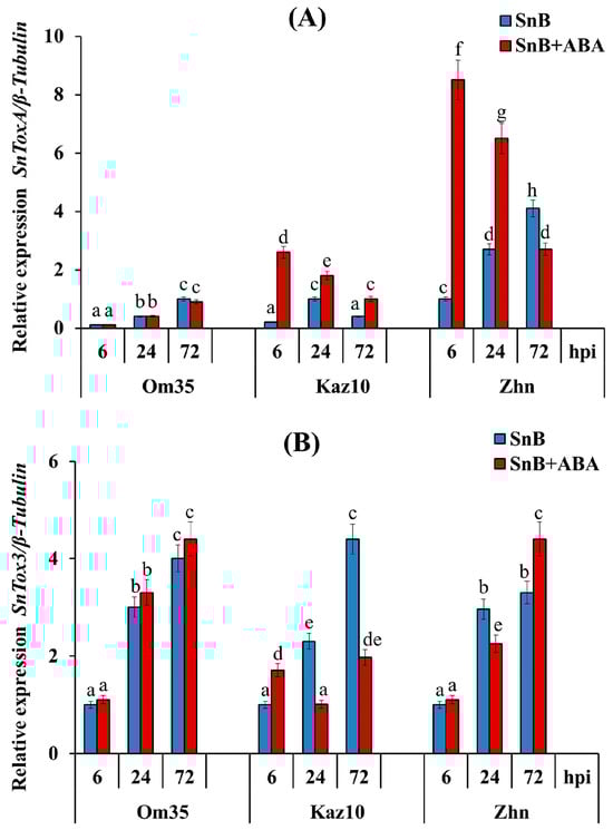 Comparative analysis of the SnTox genes’ expression in three bread wheat cultivars during treatment with ABA and infection with SnB isolate. (A) The transcript level of the SnToxA gene normalized to β-tubulin; (B) the transcript level of the SnTox3 gene normalized to β-tubulin. Designations: SnB—wheat plants untreated with phytohormone and infected with S. nodorum isolate SnB; SnB + ABA—wheat plants treated with abscisic acid (ABA) and infected with S. nodorum isolate SnB. Wheat cultivars designations: Omskaya 35 (Om35), Kazahstanskaya 10 (Kaz10), and Zhnitsa (Zhn). Average gene expression is calculated from nine biological samples of five technical replicates (n = 9). Values are expressed as mean SE (ANOVA with Duncan’s test; comparisons between genotypes are presented; significant differences are marked with different letters at p ≤ 0.05).