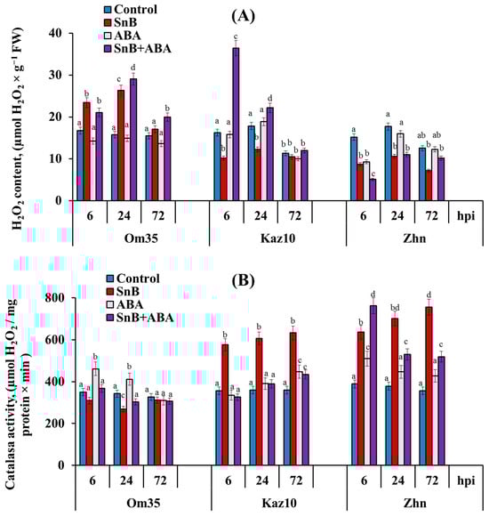 Effect of ABA treatment on changes in H2O2 content (A) and activity of catalase (B) enzyme in three cultivars of bread wheat at 6, 24, and 72 hpi with the isolate S. nodorum SnB. Designations: Control—untreated and uninfected wheat plants; SnB—wheat plants untreated with phytohormone and infected with S. nodorum isolate SnB; ABA—wheat plants treated with abscisic acid (ABA) and uninfected wheat plants; SnB + ABA—wheat plants treated with abscisic acid and infected with S. nodorum isolate SnB; FW—fresh weight. Wheat cultivars designations: Omskaya 35 (Om35), Kazahstanskaya 10 (Kaz10), and Zhnitsa (Zhn). Figures present means ± SE (n = 9) (ANOVA with Duncan’s test; comparisons with the control for each genotype are presented; significant differences are marked with different letters at p ≤ 0.05).