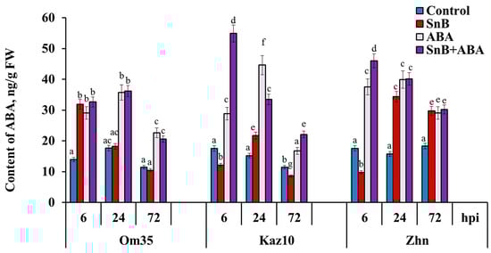 Then, the ABA content in the resistant cv. Om35 did not change at 24 or 72 hpi compared to the control (Figure 4). On the contrary, during the same infection period (24 and 72 hpi), the susceptible cv. Zhnitsa showed a 2.2- and 1.7-fold increase in the ABA content, respectively, compared to the control (Figure 4). In the susceptible cv. Kaz10, an ABA accumulation of 1.4 times compared to the control was detected only at 24 hpi, and the ABA content in this cultivar decreased at 72 hpi (Figure 4).