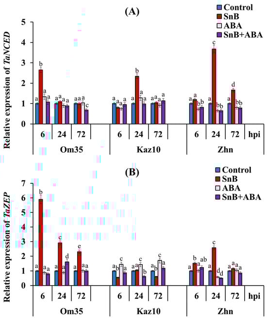 Effect of ABA treatment on expression of two genes of ABA biosynthesis—TaNCED1 (A) and TaZEP (B) in three bread wheat cultivars 6, 24, and 72 hpi with isolate S. nodorum SnB. Symbols are same as in Figure 3. Average gene expression is calculated from nine biological samples of five technical replicates (n = 9). Values are expressed as mean ± SE (ANOVA with Duncan’s test; comparisons with control for each genotype are presented; significant differences are marked with different letters at p ≤ 0.05).