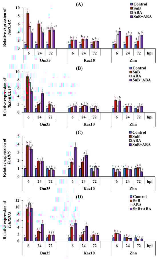 Effect of ABA treatment on the expression of four genes of ABA signaling— TaRCAR (A), TaSnRK2.10 (B), TaABI5 (C), and TaERD15 (D)— in three bread wheat cultivars at 6, 24, and 72 hpi with the isolate S. nodorum SnB. The symbols are the same as in Figure 3. Average gene expression is calculated from nine biological samples from five technical replicates (n = 9). Values are expressed as mean ± SE (ANOVA with Duncan’s test; comparisons with the control for each genotype are presented; significant differences are marked with different letters at p ≤ 0.05).