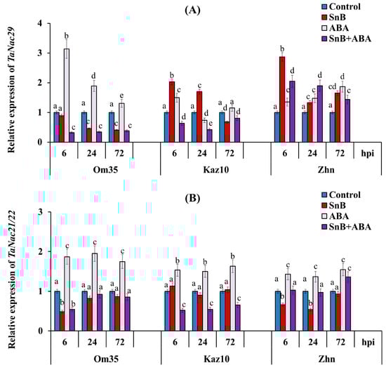 Effect of ABA treatment on expression of two ABA-inducible TF genes—TaNAC29 (A) and TaNAC21/22 (B)— in three bread wheat cultivars at 6, 24, and 72 hpi with isolate S. nodorum SnB. Symbols are same as in Figure 3. Average gene expression is calculated from nine biological samples from five technical replicates (n = 9). Values are expressed as mean ± SE (ANOVA with Duncan’s test; comparisons with control for each genotype are presented; significant differences are marked with different letters at p ≤ 0.05).