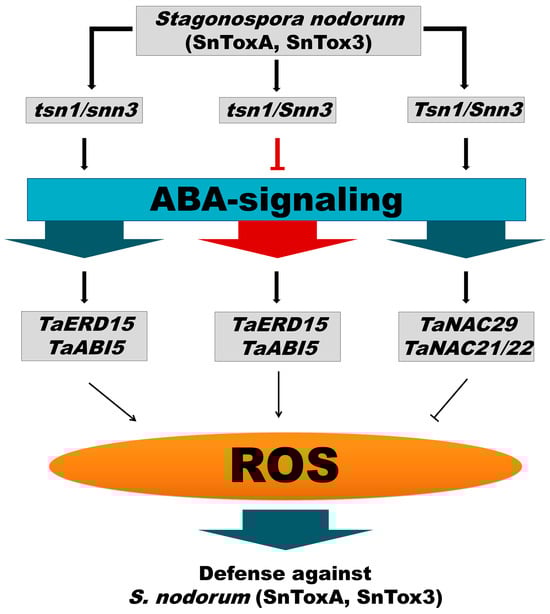 Model illustrating how NEs can manipulate the ABA signaling pathway. The black lines with arrows represent stimulatory effects, and the blunt red and black lines represent inhibitory effects. Designations: S. nodorum (SnToxA/SnTox3) is an isolate of the pathogen producing NE SnToxA and SnTox3; tsn1/snn3—the wheat genotype has recessive alleles for both susceptibility genes, so it is insensitive to SnToxA and SnTox3; tsn1/Snn3—the wheat genotype has recessive allele only for the tsn1 gene, so it is sensitive only to NE SnTox3; Tsn1/Snn3—the wheat genotype has dominant alleles for both susceptibility genes, so it is sensitive to SnToxA and SnTox3; TaERD15 / TaABI5 activation of ABA signaling occurs through the induction of the expression of the TaERD15 and TaABI5 genes; TaNAC29/TaNAC21/22 activation of ABA signaling occurs through the induction of the expression of the TaNAC29 and TaNAC21/22 genes.