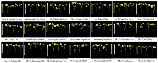 In this study, a total of 21 commercial rootstock varieties derived from Cucurbita moschata, including QuanFuTaiLang (Materials Code CK, Mc-CK), were selected as potential germplasm resources [49]. They were sourced from companies such as Shandong Shouguang Vegetable Seed Industry Group Co., Ltd (Weifang City, China). (Table S4). This field experiment was conducted in November 2022 at the teaching base of the College of Tropical Agriculture and Forestry of Hainan University (longitude: 110.328729, latitude: 20.056729, soil type: latosol). The FOC was provided by the Department of Plant Protection, College of Tropical Agriculture and Forestry, Hainan University. The pathogen was single-cell purified and preserved for further study. Initially, the pathogen was inoculated onto PDA (potato dextrose agar) medium and incubated at 28 °C for 5–7 days. Once the colony fully covered the PDA plate, a sterile punch tool was used in a biosafety cabinet to transfer the fungal disk onto fresh PDA medium. The inoculated plates were then placed on a constant-temperature shaker set to 28 °C and a rotation speed of 200 rpm for 3–4 days to promote fungal propagation. Subsequently, the fungal culture was filtered using a four-layer gauze, pre-sterilized at high temperature, into a beaker. The spore concentration was determined using a microscope and a hemocytometer, and the concentration was adjusted to 1 × 107 cfu.mL−1, the required level for inoculation. According to the observation in the preparatory test, an assessment designed to ready individuals for a subsequent, more significant exam or task, the roots of the diseased rootstock were selected for the isolation and identification of the symptomatic fungi. Verification of Koch postulates was completed, symptoms of the purified symptomatic fungi determined, and the highly purified symptomatic fungi stored in a 4 °C refrigerator as the inoculation source of the test. When the seedlings had 2 leaves and 1 heart, inoculation with Fusarium wilt was carried out. The root irrigation method of human inoculation was used to inoculate cucumber wilt fungus with a concentration of 1 × 107 cfu.mL−1. On the premise of being 1–2 cm away from the taproot and not harming the taproot, a knife was used to cut down from the surface of the soil to injure the roots of the plant and inject 10 mL of the prepared fungus solution with a syringe. The control group was inoculated with the same volume of sterile water. Watering was prohibited for 2 days after inoculation, after which normal management was carried out.