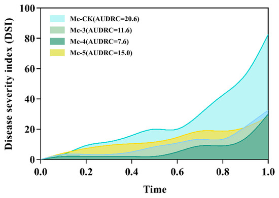 AUDRC results of rootstocks with resistance level of “resistant (R)”. The X-axis in Figure 2 represents the time elapsed since the inoculation of the rootstocks. The 21st day of the experiment is normalized to 1 on the X-axis, while the first day is normalized to 0. For reference, the 5th day is represented as 0.2 on the X-axis. This time transformation was introduced to align with the definition of the area under the receiver operating characteristic (AUC) curve in machine learning, ensuring that the highest AUC value is standardized to 1. This normalization will facilitate future comparisons between different experiments.