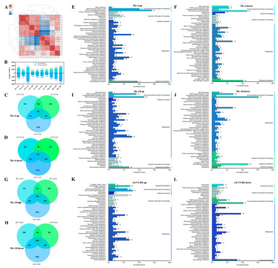 Analysis of transcriptional differences between Mc-4 and Mc-18 under FOC stress conditions. (A) Transcriptome correlation analysis under FOC stress. (B) Changes in DEGs in Mc-4 and Mc-18 under FOC stress. “Up” represents upregulated genes, and “down” represents downregulated genes. (C,D,G,H) Venn analysis ((C) Mc-4 upregulated differential genes; (D) Mc-4 downregulated differential genes; (G) Mc-18 upregulated differential genes; (H) Mc-18 downregulated differential genes). (E,F,I–L) KEGG pathways of differentially expressed genes ((E) Mc-4 upregulated differential genes; (F) Mc-4 downregulated differential genes; (I) Mc-18 upregulated differential genes; (J) Mc-18 downregulated differential genes; (K) A6 vs. B6 upregulated differential genes; (L) A6 vs. B6 downregulated differential genes). A0, and B0: Mc-4 and Mc-18, which were not inoculated with FOC, served as the control group. A2, A4, and A6: Mc-4 was treated with FOC for 2, 4, and 6 days. B2, B4, and B6: Mc-18 was treated with FOC for 2, 4, and 6 days. The length of the bars in the bar chart and the numbers on the right side indicate the number of DEGs between groups. A higher number of DEGs suggests that the pathway may be an important contributor to the differences observed between groups.
