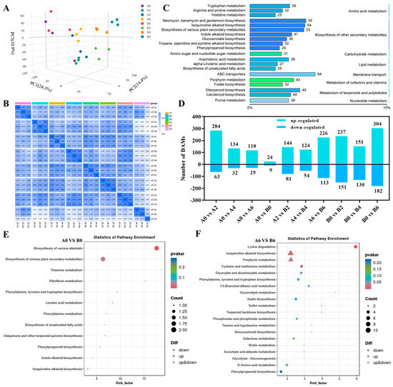 In the comparisons of A0 vs. A2, A0 vs. A4, and A0 vs. A6, Mc-4 exhibited a total of 284, 134, and 118 upregulated differential accumulation metabolites (DAMs), respectively, while 63, 32, and 29 DAMs were downregulated in Mc-4 (Figure 4D). The DAMs in the comparison of A0 vs. A2 were primarily enriched in biological processes such as porphyrin metabolism and the biosynthesis of various plant secondary metabolites. However, the differential metabolites in the comparisons of A0 vs. A4, as well as A0 vs. A6, were not only enriched in porphyrin metabolism but also in significant biological processes like the biosynthesis of isoquinoline alkaloid biosynthesis. (Figure S2A–C). In the comparisons of B0 vs. B2, B0 vs. B4, and B0 vs. B6, Mc-18 exhibited a total of 237, 151, and 304 upregulated DAMs, respectively, while 151, 130, and 182 DAMs were downregulated in Mc-18 (Figure 4D). In Mc-18, DAMs from all groups were enriched in the biosynthesis of neomycin, kanamycin, and gentamicin. However, only the DAMs from the comparison of B0 vs. B6 showed significant enrichment in the biosynthesis of isoquinoline alkaloid biosynthesis. (Figure S2D–F).