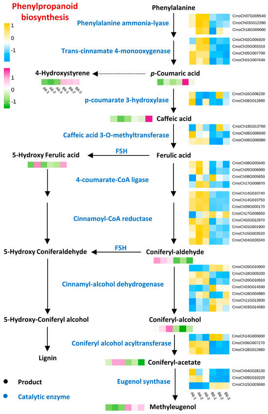 To investigate the differences in resistance to FOC between Mc-4 and Mc-18, we paid particular attention to the A6 vs. B6 comparison group, which exhibited abundant DEGs and DAMs (Figure 3 and Figure 4). During our analysis, we found that the differential genes from the transcriptome data were significantly enriched in phenylpropanoid biosynthesis (Figure 3). Additionally, the metabolome data detected a crucial differential metabolite, 4-hydroxystyrene, which is a product of phenylpropanoid biosynthesis (Figure S3). Based on these findings, we decided to focus our research on phenylpropanoid biosynthesis. In phenylpropanoid biosynthesis, a total of 37 DEGs and 8 DAMs were identified. The coefficient of variation (CV) results between replicate samples for DEGs and DAMs indicated a good degree of consistency in the data across different replicates (Table S2). The 37 DEGs encode for phenylalanine ammonia-lyase (CmoCh07G009540/03G012280/18G009000), trans-cinnamate 4-monooxygenase (CmoCh02G006920/20G003310/05G007700/01G007640), p-coumarate 3-hydroxylase (CmoCh16G006230/08G012690), caffeic acid 3-O-methyltransferase (CmoCh18G013760/06G006930/06G006980), 4-coumarate-CoA ligase (CmoCh08G005640/05G006990/08G005650/17G008870), cinnamoyl-CoA reductase (CmoCh14G010740/14G010750/09G000170/17G008650/02G012970/01G001900/15G003520/04G028340), cinnamyl-alcohol dehydrogenase (CmoCh20G010900/18G005030/20G010910/03G014590/18G004980/11G013930/03G014580), coniferyl alcohol acyltransferase (CmoCh14G000800/06G007270/18G012880), and eugenol synthase (CmoCh04G028130/09G010220/15G003690) (Figure 5). Compared to Mc-18, the stress imposed by FOC not only upregulated the expression levels of genes encoding enzymes related to phenylpropanoid biosynthesis in A6 but also increased the accumulation of coniferyl aldehyde, coniferyl alcohol, and coniferyl acetate. These results indicate that Mc-4 and Mc-18 may resist the stress imposed by FOC through phenylpropanoid biosynthesis.