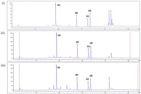 HPLC chromatograms of CA extracts prepared using (i) 100% v/v MeOH, (ii) 75% v/v MeOH, and (iii) 50% v/v MeOH at 254 nm. Peaks of important bioactive constituents are labeled as follows: (a) astragalin; (b) kaempferol; (c) aloe-emodin; (d) rhein.