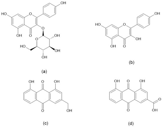 Kaempferol and astragalin are flavonoids. Meanwhile, aloe-emodin and rhein are anthraquinones with high structural resemblance (Figure 2) []. High amounts of these flavonoids and anthraquinones were also previously reported in CA leaves [,,,]. The UV spectra of astragalin, kaempferol, aloe-emodin, and rhein were compared against their respective standards (Figure 3).