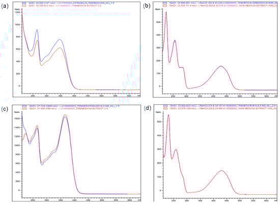 UV spectra overlay between (a) astragalin; (b) kaempferol; (c) aloe-emodin; (d) rhein in extract samples, and their respective standard reference peaks. UV spectra in blue are for samples; UV spectra in red are for standards.