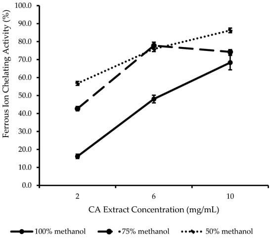 Ferrous ion chelating (FIC) activity of CA extracts prepared using 100% v/v MeOH, 75% v/v MeOH, and 50% v/v MeOH. Results are expressed as mean ± SD (n = 3).