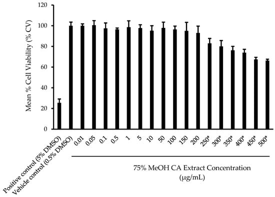 Mean percentage (%) cell viability of HaCaT cells upon treatment using 75% v/v MeOH CA extract at different concentrations. Results are expressed as mean ± SD (n = 3). Statistical differences (p < 0.05) as measured by paired samples t test between vehicle control and treated samples are indicated by the * (asterisk) symbol. Note: DMSO, dimethyl sulfoxide.