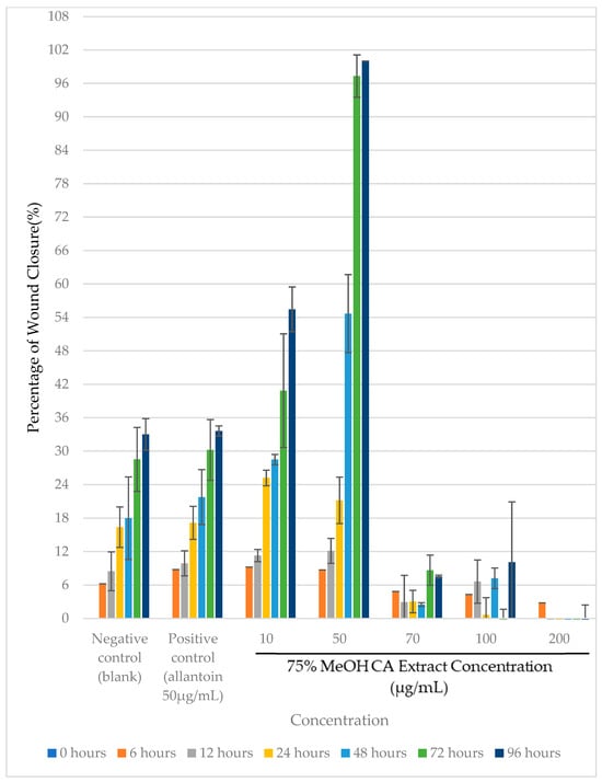 Mean migration rate of HaCaT cells at 96 h post-treatment using different concentrations of 75% v/v MeOH CA extract. Results are expressed as mean ± SD (n = 3).