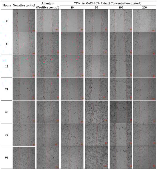Microscopy images of wound closure of HaCaT cells using different concentrations of 75% v/v MeOH CA extract taken at 0, 6, 12, 24, 48, 72, and 96 h post-treatment. Allantoin (50 µg/mL) was used a positive control.