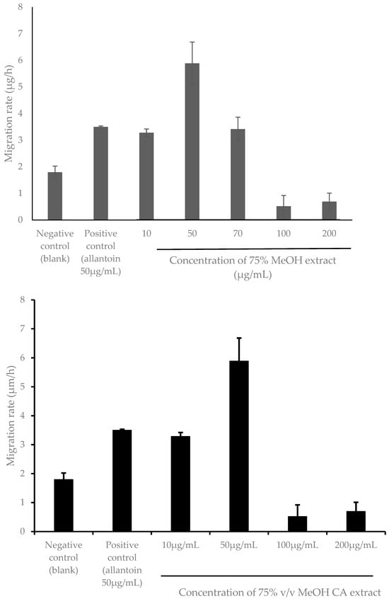 Wound healing is a complex process that consists of several phases: hemostasis, inflammation, proliferation, and tissue remodeling []. During proliferative phase of wound healing, lateral cell migration takes place where keratinocytes move as a layer across the wound to form a complete and intact monolayer. Keratinocyte cell migration, which occurs during this phase, is a rate-limiting step in skin re-epithelialization [,]. Consistent with the results in Figure 6, the 75% v/v MeOH CA extract exhibited the highest HaCaT cell migration rate of 5.886 ± 0.801 µg/h (p < 0.05) at 50 µg/mL after 96 h post-treatment (Figure 8). Similarly, a significant difference (p < 0.05) in the cell migration rate was also apparent between HaCaT cells treated with 75% v/v MeOH extract and allantoin (positive control), respectively, at the same treatment concentration (Figure 6). This further justifies the superior wound healing potency of 75% v/v MeOH extract relative to allantoin.
