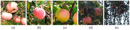 Sample of apples collected under different lighting conditions. (a) Direct light; (b) Side light; (c) Diffuse light; (d) Backlight; (e) Low light.