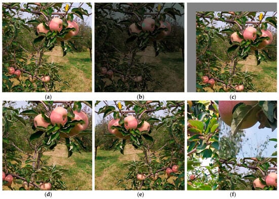 Image data augmentation. (a) Original image; (b) Random HSV adjust; (c) Random translation transformations; (d) Random Scaling; (e) Image flipping; (f) Random mosaic.