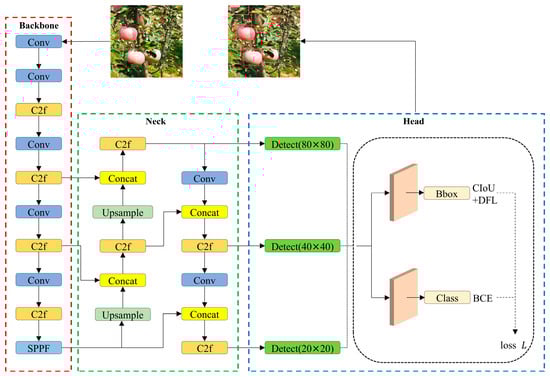 YOLOv8 is an advanced one-stage object-detection model that predicts both the category and location of objects directly within images. It incorporates design ideas from ELAN (Efficient Layer Aggregation Network) in YOLOv7 and the decoupled head from YOLOv6, building on the foundation of YOLOv5. Furthermore, YOLOv8 introduces a novel backbone architecture and an innovative anchor-free detection head. The YOLOv8 family comprises five sub-models: YOLOv8n, YOLOv8s, YOLOv8m, YOLOv8l, and YOLOv8x. To achieve faster apple detection with a smaller model size and lower computational requirements, YOLOv8n was selected as the benchmark model. The structure of YOLOv8n consists of four parts: the backbone, the neck, the head, and the loss function, as illustrated in Figure 5.