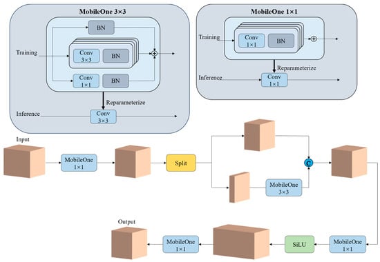 To effectively extract spatial features, we introduced re-parameterizable skip connections with batch normalization (BN), along with trivially overparameterized branches, into the convolutional layers of the PCMR. During inference, a re-parameterization process eliminates these branches []. Specifically, each BN layer is folded into its preceding convolutional layer, and skip connections are treated as 1 × 1 convolutions. In modules with different kernel sizes, smaller convolution kernels are zero-padded to match the larger kernel size. Ultimately, a final convolution kernel is obtained by summing multiple kernels of the same size.