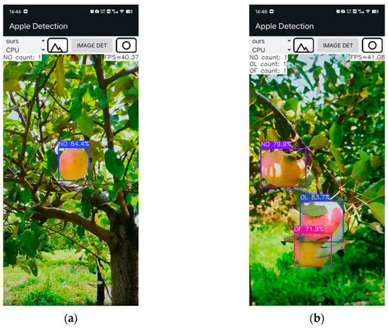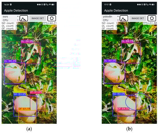 The apple-detection application developed in this study achieved a detection speed of 40 FPS on an iQOO Neo6 SE smartphone using the improved YOLOv8n model, compared to 32 FPS with the original YOLOv8n model, as shown in Figure 14. Moreover, Figure 14 illustrates that the improved YOLOv8n model correctly detected all apples in the image, whereas the original YOLOv8n model missed one. These results suggest that the improved YOLOv8n model significantly improves both the speed and accuracy of apple detection.