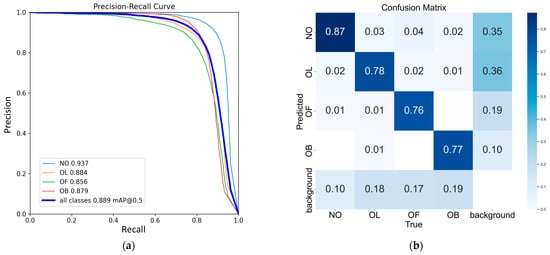 PolyLoss is more flexible than BCE Loss (which is a special case of PolyLoss) and can be customized for specific data sets. For our data set, the optimal polynomial coefficient, , for PolyLoss was found to be −0.3. A negative reduces prediction confidence, achieving effects similar to label smoothing and confidence penalties [], which helps the YOLOv8 model achieve higher detection accuracy.