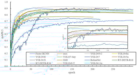 The mAP curves for the different models are depicted in Figure 11. During the first 80 iterations, the mAP increased rapidly for all models, then slowed down, stabilizing around epoch 300. Early stopping was used to prevent overfitting in the improved YOLOv8n model and several others. The mAP progression indicates that, although the improved YOLOv8n model did not experience the fastest mAP increase in the early epochs, it outperformed other lightweight models after 150 epochs.