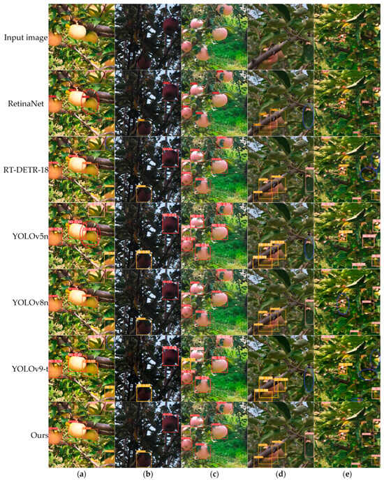 To provide a more intuitive evaluation of the detection performance of different object-detection models in complex orchard environments, images from various scenarios were chosen at random from the test data set for analysis. Figure 12 shows the detection results for apples under different lighting conditions and occlusion levels using several of the models evaluated in this study. Notably, the other models not depicted in the figure successfully detected all apples shown.
