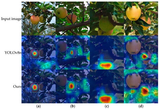 Grad-CAM [] uses gradients to determine the importance of different regions in an image for the prediction result, thereby generating visualizations. Regions considered important by the detection model are highlighted in red, with deeper red indicating greater importance, while yellow and blue represent lesser contributions and almost no contribution, respectively. Figure 13 shows heat maps for different apple subcategories, illustrating that the model primarily concentrates on the central region of non-occluded apples. In contrast, it focuses on the junction between the apple and the occluder when detecting occluded apples. Additionally, Figure 13 illustrates that the improved YOLOv8n model focuses on more target regions compared to the original YOLOv8n model, enabling it to learn and utilize more discriminative features.