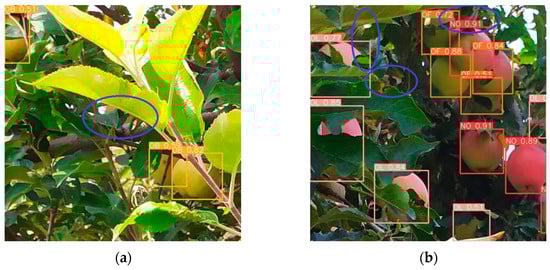 The potential causes for these missed detections include: (1) Excessive occlusion of the apples results in fewer visible pixels, which makes it challenging for the model to extract sufficient and effective discriminative features, thereby leading to missed detections. (2) As illustrated in Figure 15a, an apple that is mostly occluded by leaves and whose color closely matches the background increases the complexity of the detection task.