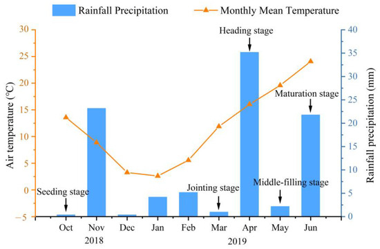 Variation in monthly rainfall and average temperature during the entire growth period of wheat.