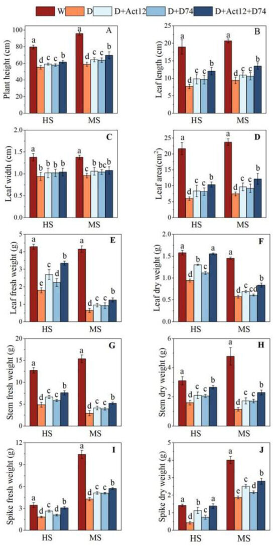 Effects of Streptomyces inoculation (Act12, D74, and their combination) under normal irrigation and drought stress on plant height (A), leaf length (B), leaf width (C), leaf area (D), and fresh (E,G,I), and dry weights (F,H,J) of leaves, stems, and spikes of wheat at heading (HS) and grain-filling (MS) stages. Data are presented as the mean ± SD (n = 5). Different letters indicate significant differences between treatments (p < 0.05).