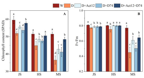Effects of Streptomyces inoculation (Act12, D74, and their combination) under normal irrigation and drought stress on chlorophyll content (SPAD, (A)) and maximum photochemical efficiency (Fv/Fm, (B)) in wheat leaves at the jointing (JS), heading (HS), and grain-filling (MS) stages. Data are presented as mean ± SD (n = 5). Different letters indicate significant differences between treatments (p < 0.05).