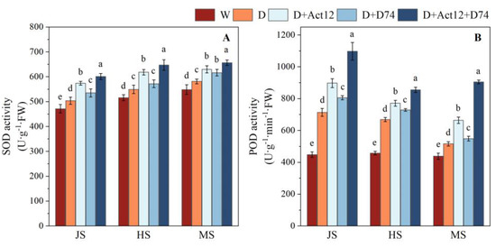 Effects of Streptomyces inoculation (Act12, D74, and their combination) under normal irrigation and drought stress on antioxidant enzyme activities, including superoxide dismutase (SOD, (A)) and peroxidase (POD, (B)) in wheat leaves at the jointing (JS), heading (HS), and grain-filling (MS) stages. Data are presented as the mean ± SD (n = 3). Different letters indicate significant differences between treatments (p < 0.05).