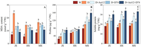Effects of Streptomyces inoculation (Act12, D74, and their combination) under normal irrigation and drought stress on malondialdehyde (MDA) (A), proline (B), and soluble protein (C) content in wheat leaves at the jointing (JS), heading (HS), and grain-filling (MS) stages. Data are presented as mean ± SD (n = 3). Different letters indicate significant differences between treatments (p < 0.05).