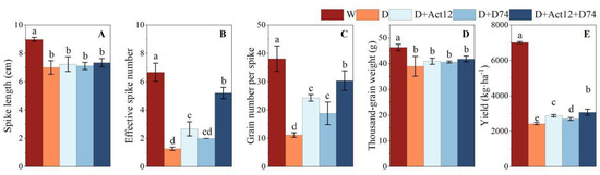 Effects of Streptomyces inoculation (Act12, D74, and their combination) under normal irrigation and drought stress on spike length (A), effective spike number (B), grain number per spike (C), thousand-grain weight (D), and grain yield (E) of wheat. Data are presented as mean ± SD; spike length, effective spike number, grain number per spike, and thousand-grain weight, n = 5; grain yield, n = 3. Different letters indicate significant differences between treatments (p < 0.05).