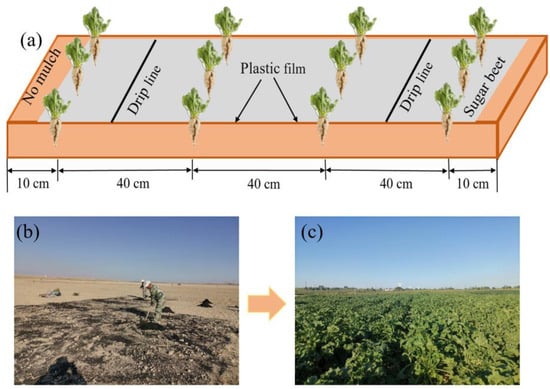 Schematic diagram (a) and experimental planting (b,c) of sugar beet planting under plastic mulched-drip irrigation.