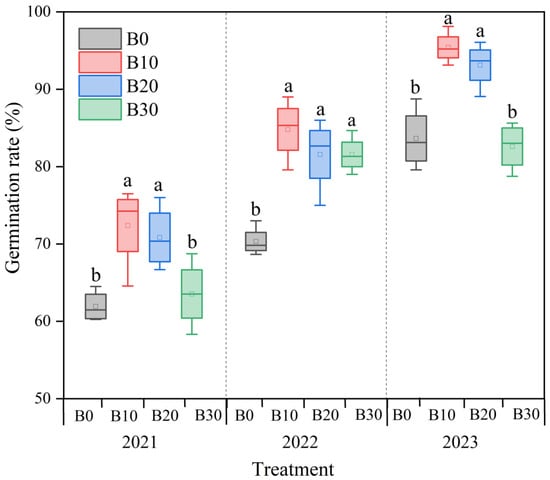 Under consistent irrigation amounts, the one-time biochar application in 2021 led to a gradual increase in the sugar beet germination rate from 2021 to 2023 (Figure 2), ranging 60.3–75.0%, 68.3–84.7%, and 79.6–95.4%, respectively. The highest germination rate was consistently observed under the B10 treatment. Compared to the control (B0), the germination rates for the B10, B20, and B30 treatment groups increased by 19.9–24.5%, 14.1–21.4%, and 7.2–18.9% over the three years, respectively.
